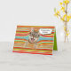 Happy birthday tabby cat with black rimmed eyeglasses on colorful striped background.
