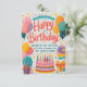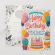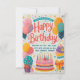 The card features a colorful and festive design with the phrase “Happy Birthday” prominently displayed in the center. It is adorned with balloons, cupcakes, a birthday cake with candles, and a gift box. The background includes stars and dots, adding to the celebratory atmosphere.