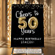 Celebrate a 50th birthday with a welcome sign printed on foam board featuring the title CHEERS TO 50 YEARS with faux metallic gold balloon numbers and modern script typography, confetti and your custom message in your choice of background color (shown in black). OPTIONS: The sample is shown in a 18x24" size; other sizes are available (choose Custom Size for even borders by changing the height and width proportionately AFTER clicking the UNLOCK icon that looks like a chain link). You can also transfer the design to a poster, banner, tapestry backdrop or other products or have the designer convert it to a DIGITAL DOWNLOAD file for local printing. ASSISTANCE: For help with design modification or personalization, resizing or transferring the design to another product, contact the designer BEFORE ORDERING via the Zazzle Chat MESSAGE tab below or email makeitaboutyoustore@gmail.com.