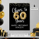 Celebrate a 60th birthday with a welcome sign printed on a poster print featuring the title CHEERS TO 60 YEARS with faux metallic gold balloon numbers and modern script typography, confetti and your custom message in your choice of background color (shown in black). OPTIONS: The sample is shown in a 18x24" size on Value Paper (Matte); other standard and custom print sizes, paper quality and framing, Instant Digital Download file for printing locally or transferring the design to a foam board, banner, canvas or other product options are available on the ordering page. RESIZING TIP: Choose Custom Size for even borders by changing the height and width proportionately AFTER clicking the UNLOCK icon (looks like a chain link). ASSISTANCE: For help with design modification or personalization, color change, resizing or transferring the design, contact the designer BEFORE ORDERING via the Zazzle Chat MESSAGE tab or email makeitaboutyoustore@gmail.com.