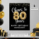 Celebrate an 80th birthday with a welcome sign poster print featuring the title CHEERS TO 80 YEARS with faux metallic gold balloon numbers and modern script typography, confetti and your custom message in your choice of background color (shown in black). OPTIONS: The sample is shown in a 18x24" size on Value Paper (Matte); other standard and custom print sizes, paper quality and framing, Instant Digital Download file for printing locally or transferring the design to a foam board, banner, canvas or other product options are available on the ordering page. RESIZING TIP: Choose Custom Size for even borders by changing the height and width proportionately AFTER clicking the UNLOCK icon (looks like a chain link). ASSISTANCE: For help with design modification or personalization, color change, resizing or transferring the design, contact the designer BEFORE ORDERING via the Zazzle Chat MESSAGE tab or email makeitaboutyoustore@gmail.com.