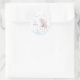 Birthday Classic Round Sticker with an adorable unicorn with wings, which is surrounded by cute pictures of a magical castle, clouds and festive bunting.