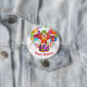 This round button pin is shown with a festive Birthday Clown mask print design.