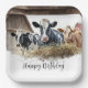 Three watercolor cows by barn feed trough filled with hay with text for birthday party.