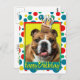 Celebrate a birthday with this whimsical Bulldog Greeting Card. With a cupcake balanced on it's head, this design is sure to bring a smile and giggles! BTW, This design has several versions, with different background colors. There is also an invitation to a Party version.