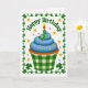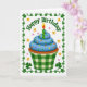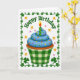 This design shows a pixel-art birthday cupcake centered on a white background, topped with a tall green candle with faint horizontal stripes and a small golden flame. Sky-blue frosting swirls high, dotted with round sprinkles in orange, yellow, green, and magenta that feel like confetti shared between close friends. The cupcake wrapper has a green-and-cream checker pattern that nods to a lucky, Irish-leaning party mood ☘️. Above the cupcake, “Happy Birthday” arches on a diagonal in emerald green, standing out clearly against the pale space. A border of intertwined shamrocks and curling vines frames the scene in layered greens, like a gentle hug around the treat 💚. Tiny golden pixel stars and small pink asterisks are scattered around the background, adding sparkle without crowding the main image. The green shamrock border loops at the corners, with gold star specks and pink asterisks floating near the top and sides.