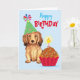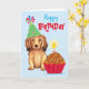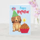 Happy birthday greetings with this cute design featuring a smiling, party hat-wearing Longhaired Dachschund puppy with a birthday cupcake. Text can be easily changed; just click on customize button.