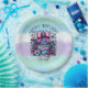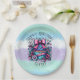 Graphics of a vanilla cupcake with purple and blue frosting with flowers and a bow. Purple, teal, blue and pink personalized birthday plates for a birthday party.