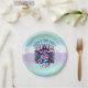 Graphics of a vanilla cupcake with purple and blue frosting with flowers and a bow. Purple, teal, blue and pink personalized birthday plates for a birthday party.