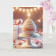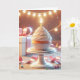 A beautifully decorated cupcake with a lit candle sits on a pedestal, surrounded by festive decorations including presents and string lights.