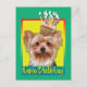 Celebrate a birthday with this whimsical Yorkshire Terrier Dog Greeting Card. With a cupcake balanced on it's head, this design is sure to bring a smile and giggles! BTW, This design has several versions, with different background colors. There is also an invitation to a Party version.
