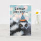Cute birthday, paper greeting card with a photo of a ring tailed lemur wrapped up in its tail and wearing a polka dotted birthday hat. Wildlife themed greeting card. Lemur just say ... or Let me just say... pun written on the cover. Customize the interior birthday message as desired. Art, image, and verse copyright © Shoaff Ballanger Studios, 2024.