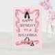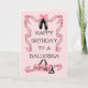 The perfect birthday greeting for a ballerina: All in pink and black, ribbons, a decorated bag, ballet shoes and inside a folk art ballerina. You can personalize this card to make a unique message on the special day of a dancer!