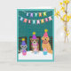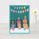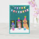 This is a birthday card that has three dogs sitting at the table with cupcakes in front of them and wearing party hats The background is a teal brick wall with a banner that says, ‘Happy Birthday.’