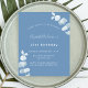 A dusty blue background, decorated with eucalyptus stems, sprigs. Personalize and add a name and party details.