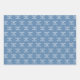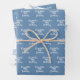 Elegant, trendy party wrapping paper sheets. 2 sheets with dusty blue backgrounds, white text. One sheet with white background and blue text.