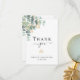 A modern and elegant 50th (or any age) birthday thank you card. A chic white background. Decorated with green watercolored eucalyptus leaves, sprigs, greenery and a faux golden sprigs. Black text. On the front the text: Thank You, name, and a date.