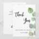 A chic white background decorated with eucalyptus greenery. On front large black colored hand lettered script and the text: Thank You, your and a date.