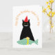 Happy birthday black cat sits before wrapped fish.