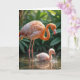 A vibrant scene features a tall flamingo standing beside its chick as it splashes in the water, surrounded by lush green foliage.