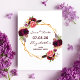 On front: Trendy bohemian boho style. Decorated with watercolored roses in burgundy and pink. Elegant white background. A faux gold geometric frame and templates for a name, date and age. Burgundy colored letters. The name and the text: Save the Date are written with a modern hand lettered style script.