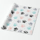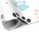 This design features pink blue and gray dog paw prints in a seamless pattern over a white background. This is perfect for wrapping dog birthday presents.