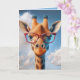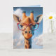 A giraffe sporting red glasses gazes directly at the viewer against a backdrop of fluffy clouds and a clear blue sky.