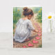 A young girl in a white dress places pink heart shapes along a pathway surrounded by lush greenery and blooming flowers.