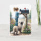 A young girl balances on a large dog's back to reach an open mailbox along a country road lined with vibrant flowers.