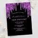 A girly and feminine 50th (or any age) birthday party invitation. On front: A chic black background. Decorated with dark purple faux glitter drips, paint dripping look. Personalize and add a name and party details. The name is written with a hand lettered style script, light purple colored letters.