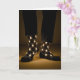A pair of men's feet wearing black socks with a glowing light string design, standing on a wooden floor.
