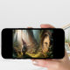 A small gnome with a long hat stands in a lush, green forest, pointing at a large, moss-covered clock nestled among the trees