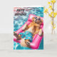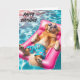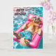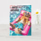 A golden retriever dog lounges on a pink inflatable air mattress in a swimming pool while wearing sunglasses and blue swim trunks decorated with pink flowers for a birthday.