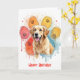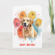 A golden retriever dog sits in front of colorful paw print, showcasing a colorful blend of orange, blue, and gold watercolor design.