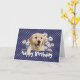Cute golden retriever with white daisies on a navy blue and white polka dot pattern for any age birthday.