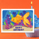 A fancy goldfish in an aquarium with brightly colored plants and sand. Colors include orange, blue, purple, tan, and pink. This birthday card is perfect for anyone who loves the hobby of fish keeping. Inside: Blank