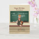 A baby sandhill crane bird is dressed as a physics teacher. In this humorous image on a birthday card for a grandson the bird wears glasses, a bow tie, and a brown vest completed with a gold watch chain giving the appearance of a very serious teacher or student. He stands in front of a green chalk board filled with scientific equations. All text fields are text templates and easily changed or deleted.