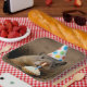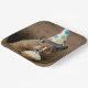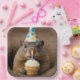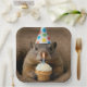 A festive groundhog in a colorful party hat holds a cupcake with a lit candle as it peeks out from its burrow