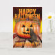 Full of creepy fun a Halloween Birthday card featuring a pumpkin about to me snatched up by sinister skeleton hands oooo, an eager rat sniffs awaiting his feast.