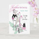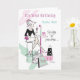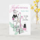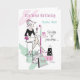 For Her. Shop 'til you drop, relax and unwind is the theme of this stylish female birthday card. The trendy illustration in shades of pink and mint green with a touch of black features a young woman enjoying a glass of wine and a cup of coffee at a chic cafe table after an enjoyable day shopping. Original artwork by Carol M.Kearns.