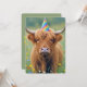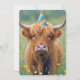 A Highland cow stands in a field of colorful wildflowers, wearing a birthday party hat.