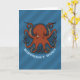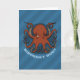 A greetings card featuring a cartoon of a rust red octopus with a mean frown, curling tentacles spread in all directions and fleshy colored suckers exposed. A shoal of fish stream past in the background. For fans of octopuses and cephalopods with attitude. Legend reads: BIRTHDAY HUG? Alternatively you can write own legend with a simple change to the editable text which curves around the image. Customize your card to change the deep sea blue background color which surrounds and shows through the semi-transparent background shape and stripes.
