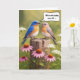 Two vibrant bluebirds perch atop a wooden fence post, surrounded by blooming pink cone flowers and white Queen Anne's Lace flowers in a summer meadow.