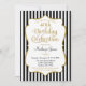 Plain white envelopes are included with paper invitations and will come to fit the invitation size you select. If you don’t need the envelopes, you may choose to not receive them by selecting the dropdown below "Envelopes" and choosing "None." If you’d like to have a design on your envelopes, you can browse all of these available envelopes to find the design that complements your Birthday Invitation Black Gold Elegant Stripe.