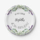 A paper plate for a boho, french country style party, any age. A chic white background decorated with lavender flowers and eucalyptus greenery. The text: The name is written with a large modern hand lettered style script. Personalize and add a date, name and age.
