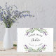A stylish white background decorated with violet lavender flowers and eucalyptus greenery. Personalize and add a name.