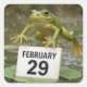 A frog leaps over a calendar page marked February 29, with sparkling water droplets and a vibrant green background symbolizing a leap year.