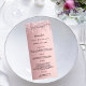 Birthday party menu card. Personalize and add a name, age, date and the menu. Blush pink faux metallic looking background, decorated with faux glitter drips. Black colored letters.