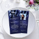 Personalize and add a name, age and your menu. A navy blue background. The blue color is uneven. White colored letters. Decorated with blue balloons.