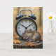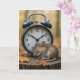 A small mouse peacefully sleeps next to a retro alarm clock on a tree stump surrounded by autumn leaves, set against a backdrop of a forest scene filled with warm autumn color.